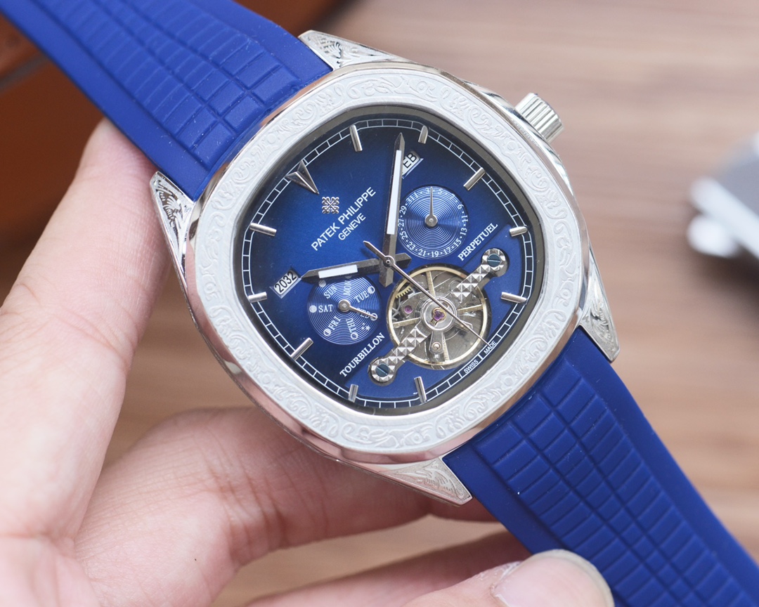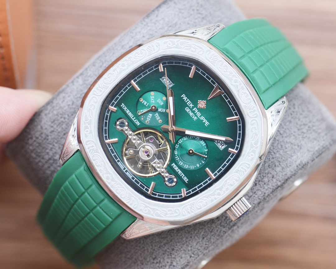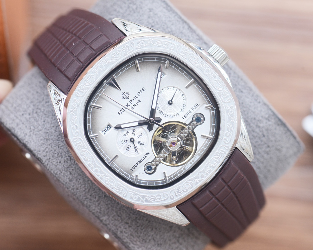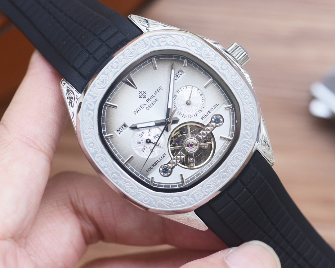 Elevate your wrist game with this Patek Philippe automatic watch. Featuring a durable rubber strap and unique engraved case design.