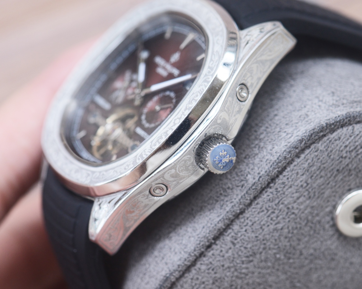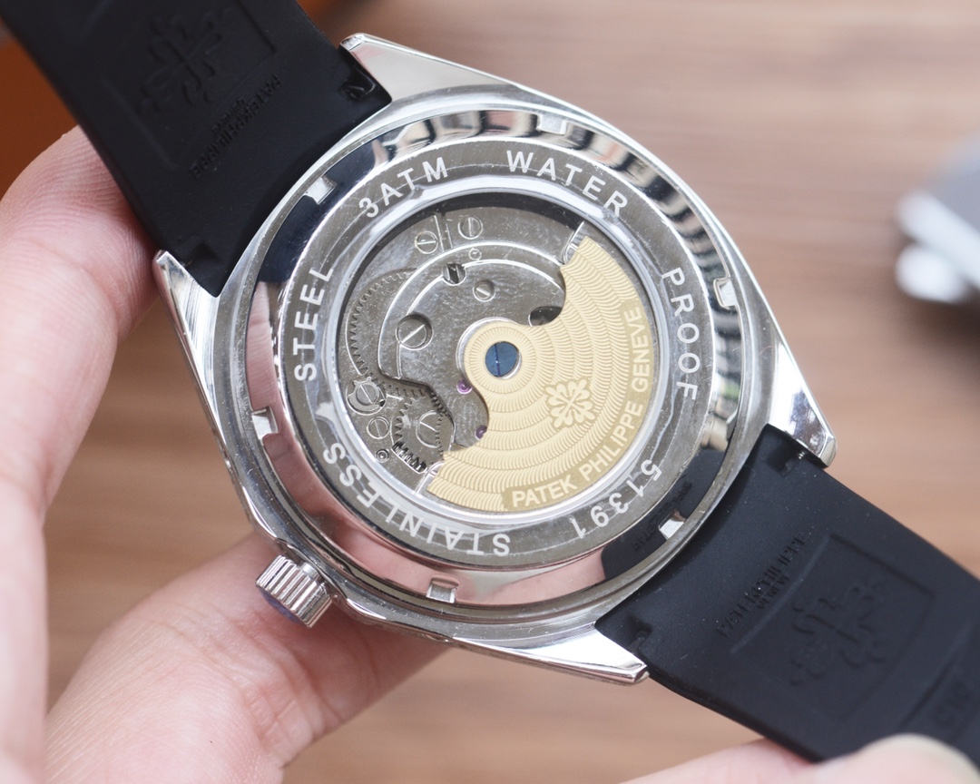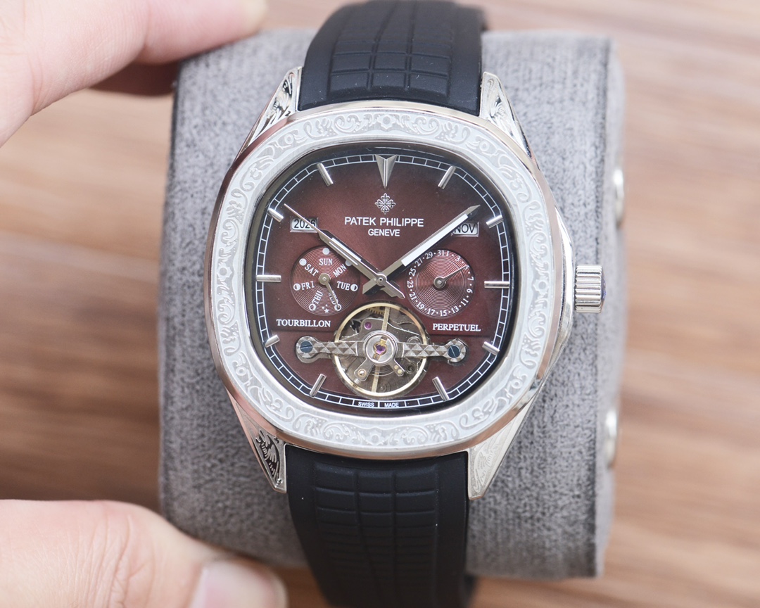 Elevate your wrist game with this Patek Philippe automatic watch. Featuring a durable rubber strap and unique engraved case design.