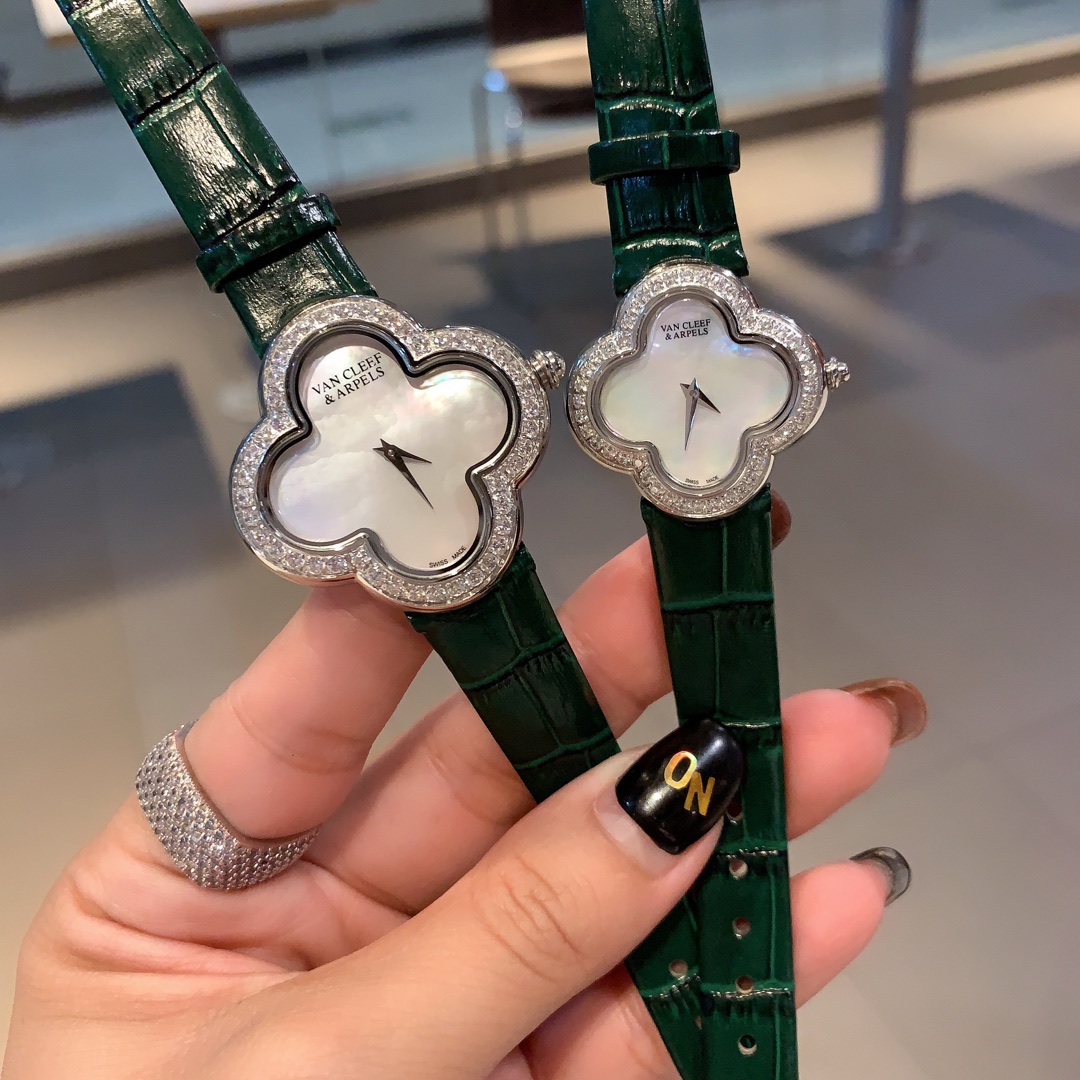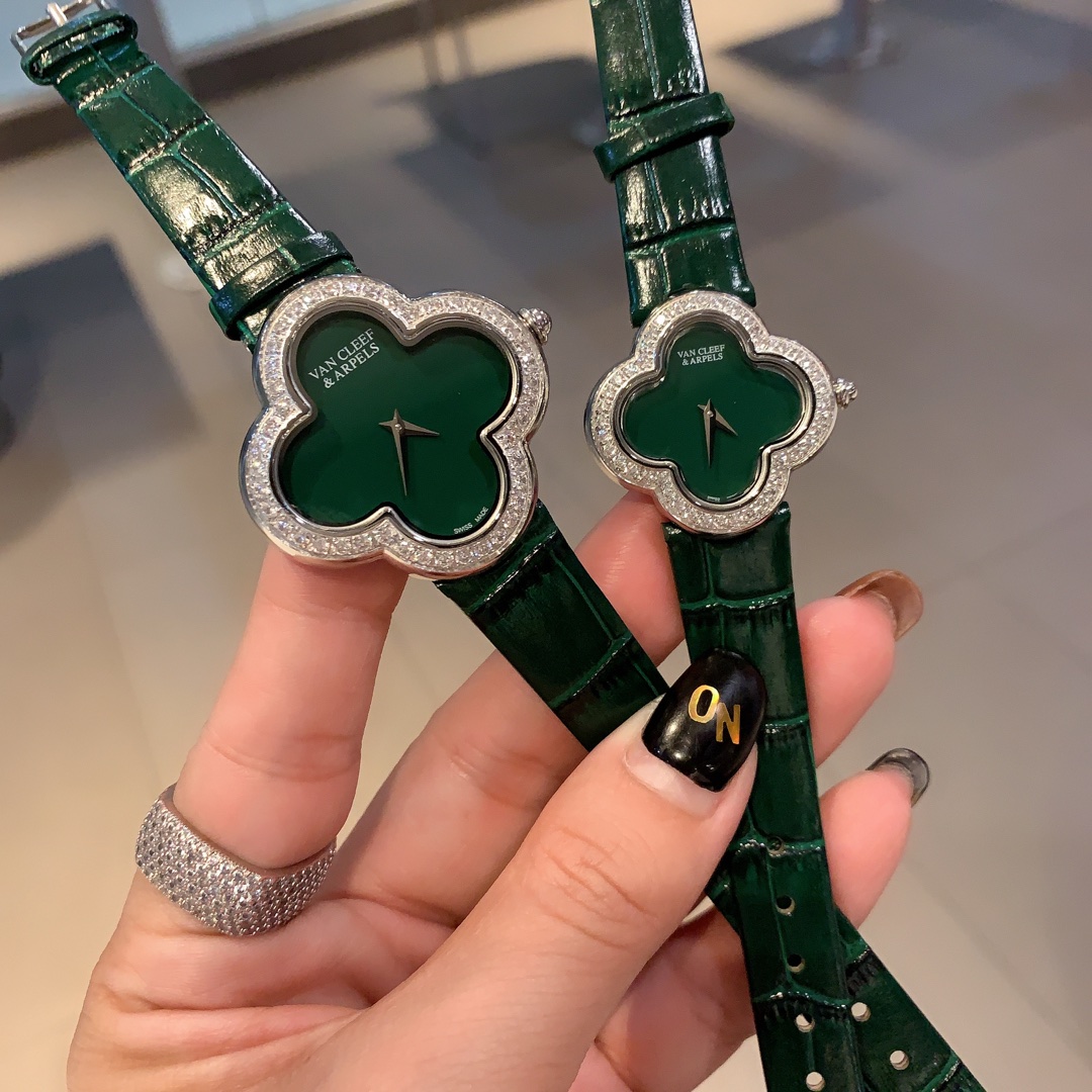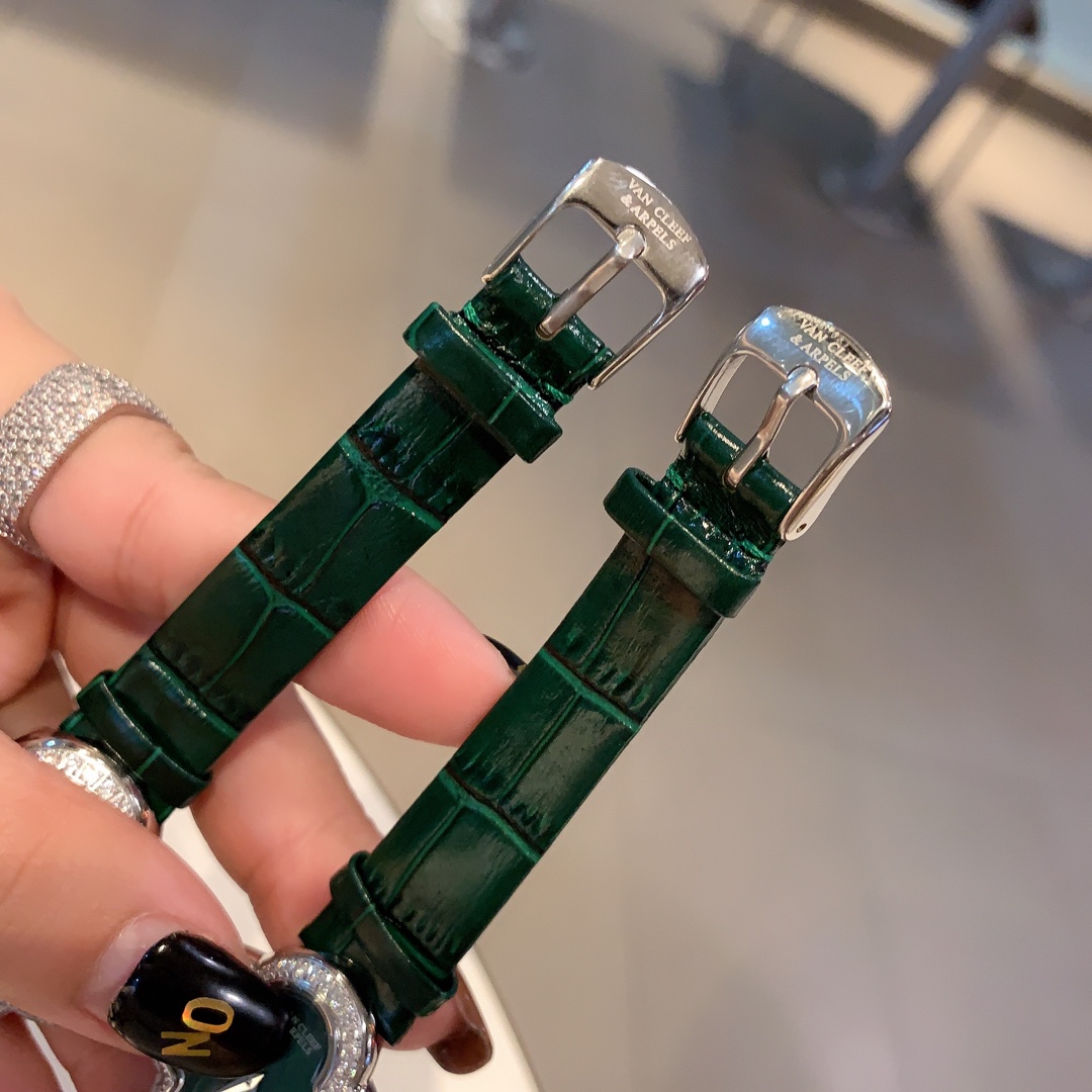 Elegant Van Cleef & Arpels Alhambra Vintage watch featuring a clover design, green leather strap, and sparkling crystal accents. A timeless piece for any occasion.