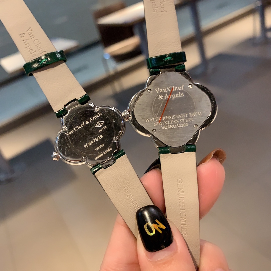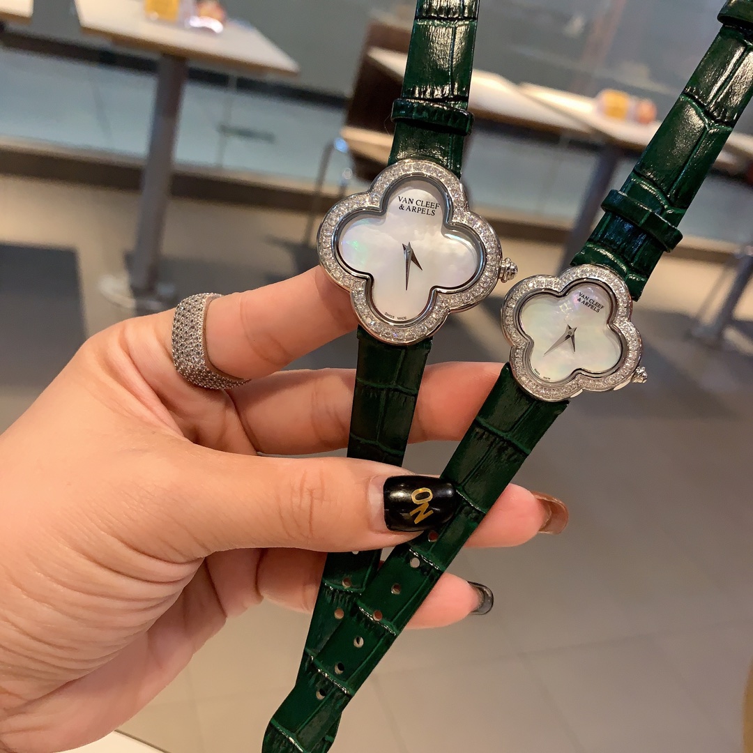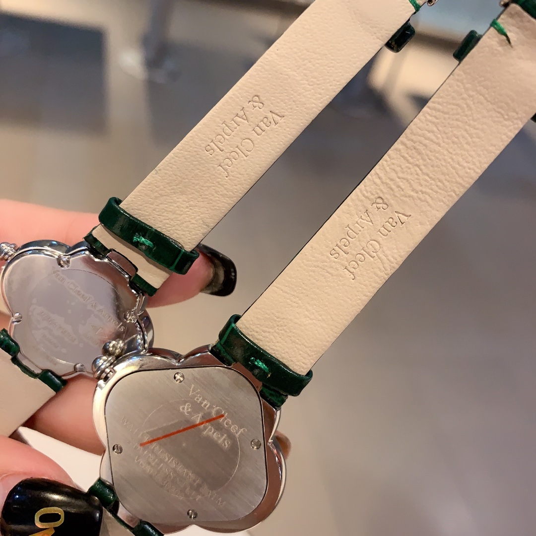 Elegant Van Cleef & Arpels Alhambra Vintage watch featuring a clover design, green leather strap, and sparkling crystal accents. A timeless piece for any occasion.
